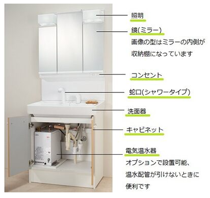 基本的な形状は変わりませんが、機能が異なります。三面鏡が付いたタイプ、蛇口シャワーとなっているタイプ、鏡を壁に取り付け、洗面台とセパレートになってとるタイプなどです。ネットで見たからと即決せず、まずは実際にショールームなどで物の大きさや形状、機能をチェックしておくと良いでしょう。