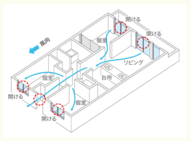 たとえば、マンションなどで窓が1方向にしかない場合、バルコニー側の窓を開き、室内や廊下の扉をすべて開け、防犯に配慮しながら玄関ドアを開ければ、各部屋に新鮮な空気を行き渡らせることができます。