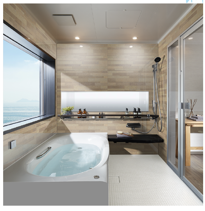 アライズkタイプ:壁パネルHFセブストーン(セブ島の天然石を再現した柄)とホワイト色の浴槽で自然に囲まれたような落ち着きのある空間をコーディネート。