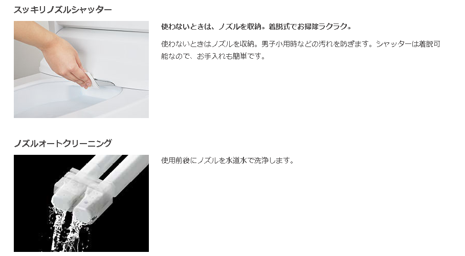 リクシルのトイレはノズルまわりの掃除もしやすくなり、新機能「ノズル除菌」が追加されました!