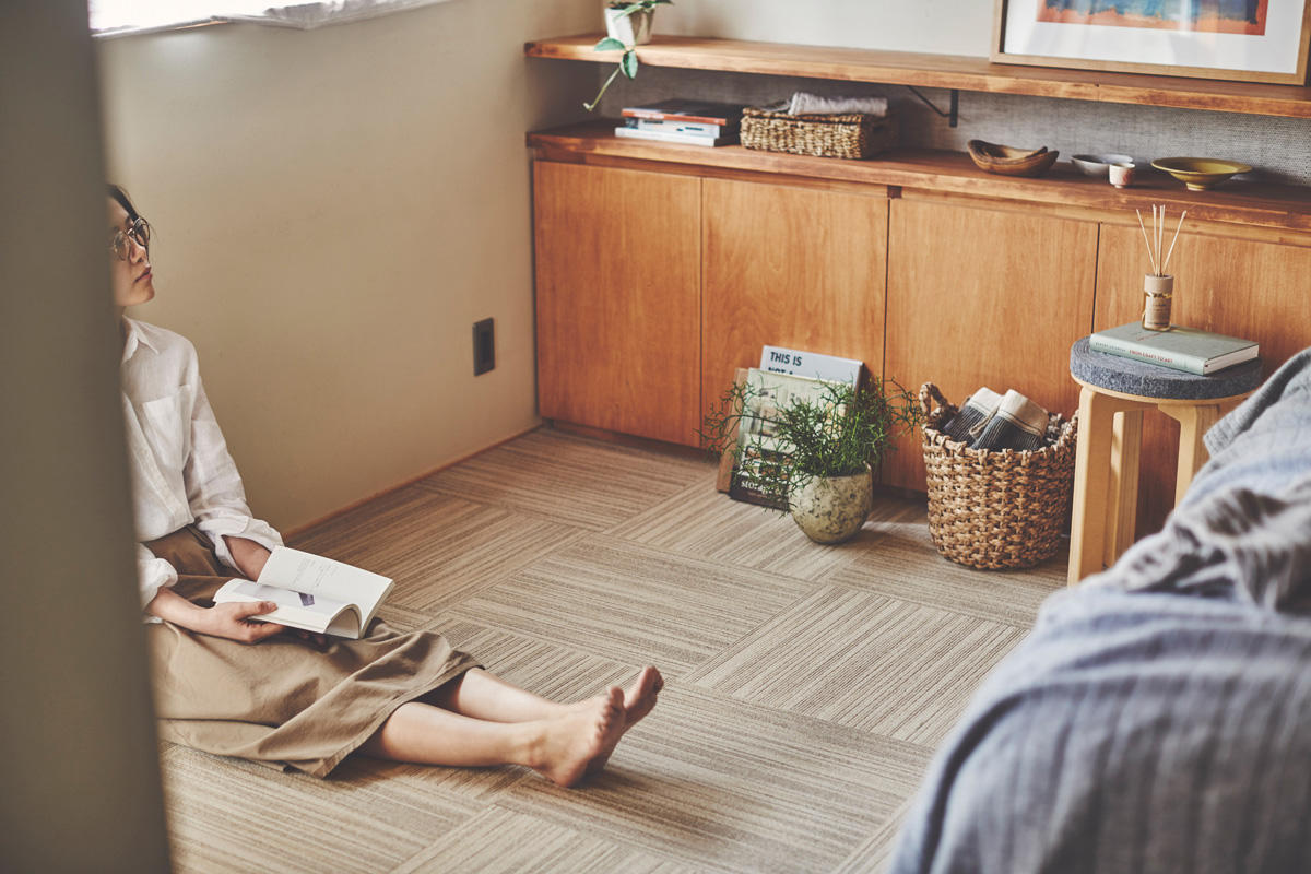 置くだけでズレない住宅用タイルカーペット。お部屋の一部に敷いてラグにしたり、すき間なく敷き詰めたり、色や柄を組み合わせてたり、アレンジを楽しめます。
