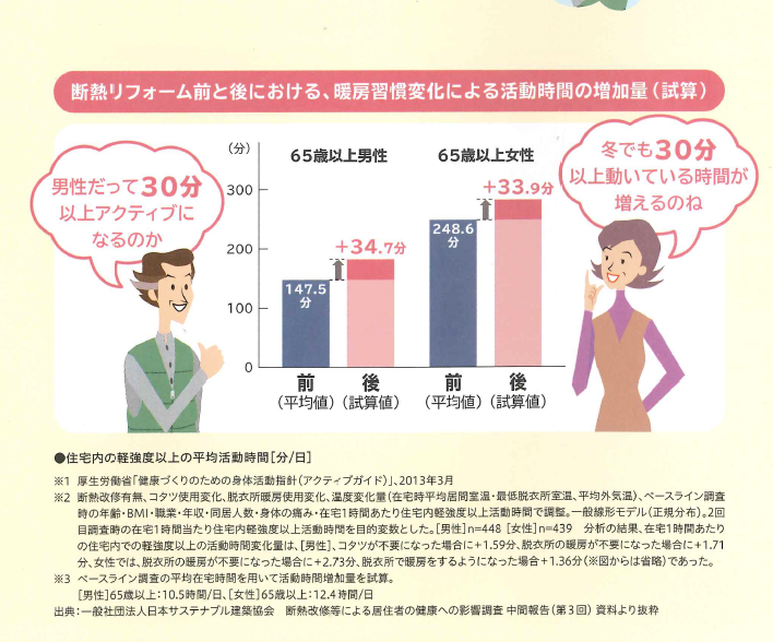 断熱リフォームによって居間や脱衣所の室温が上昇し、暖房が不要となった場合などに、1日平均の住宅内軽強度以上の活動時間が男女共それぞれ増加したことが分かりました。