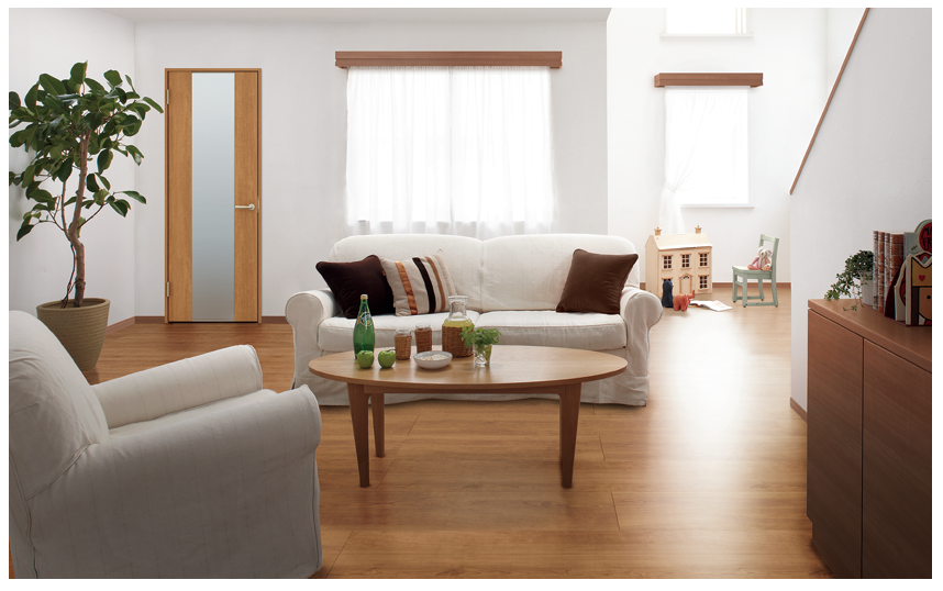 床と室内ドアのカラーを同系色にすると、下面がまとまり落ち着いたコーディネートになります。また、壁に合わせると空間の広がりが感じられ、家具などのメインカラーにあわせると、スタイルが際立ちます。