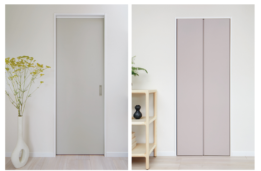 おすすめカラー:左/新色「ソフトグレー」の引戸にはシャインニッケルの引手が馴染みよく。右/新色「ソフトモーブ」のクローゼット両開き戸。木目との相性がよく、ほのかな色味がグレージュ系コーディネートを引き立ててくれます。