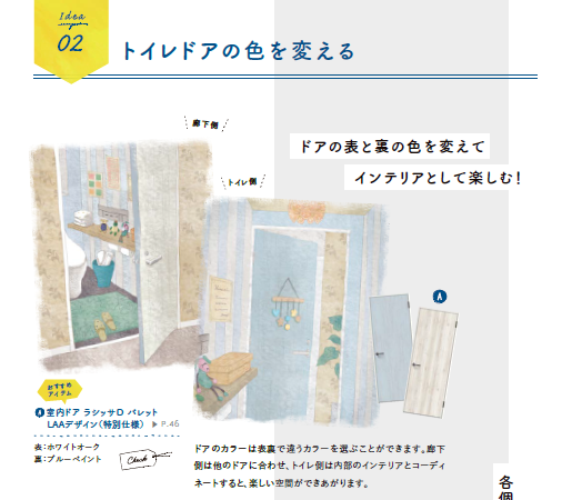 ドアのカラーは表裏で違うカラーを選ぶことができます。廊下側は他のドアに合わせ、トイレ側は内部のインテリアとコーディネートすると、楽しい空間が出来上がります。