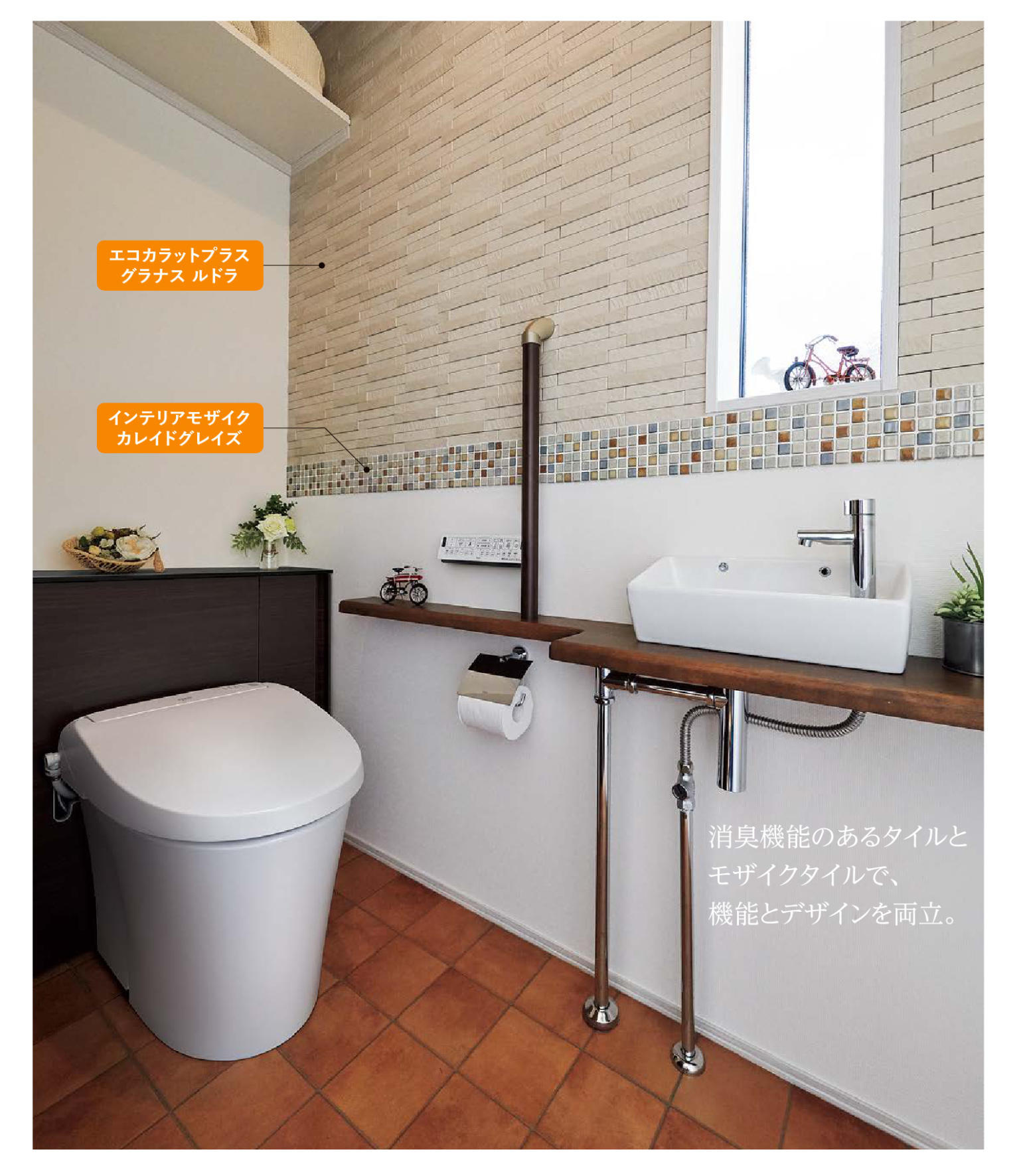 いろんなプラスαを持っているタイル。消臭機能のあるタイルとモザイクタイルで、機能とデザインを両立したトイレ空間。