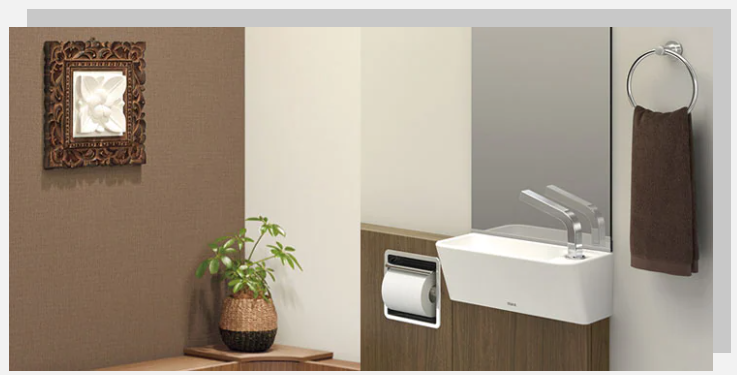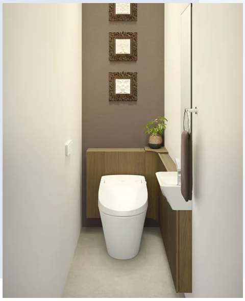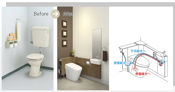 既設の給排水を利用して、タンク付きトイレからタンクレストイレ+手洗器の空間へリフォームできます。