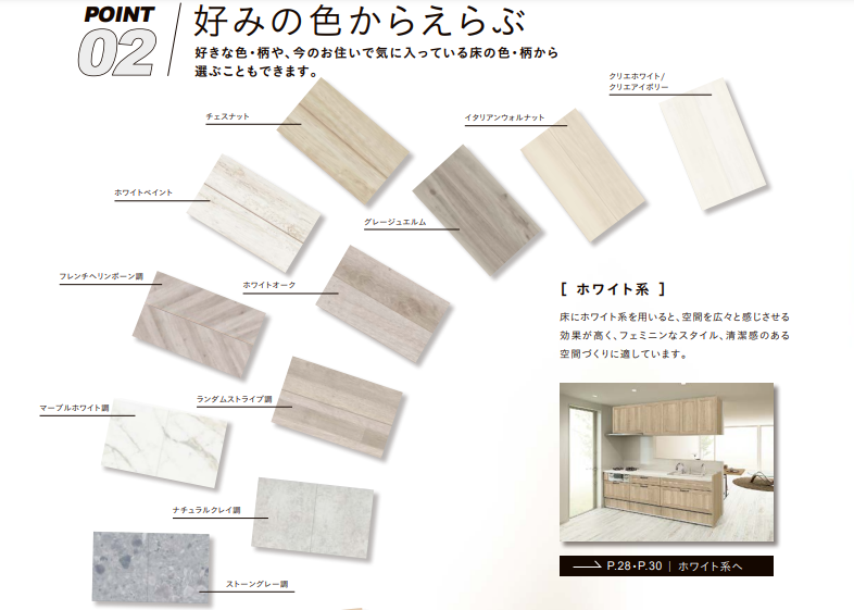 一覧へ戻る室内の床選び。好きな色・柄や、今のお住まいで気に入っている床の色・柄から選ぶこともポイントです。