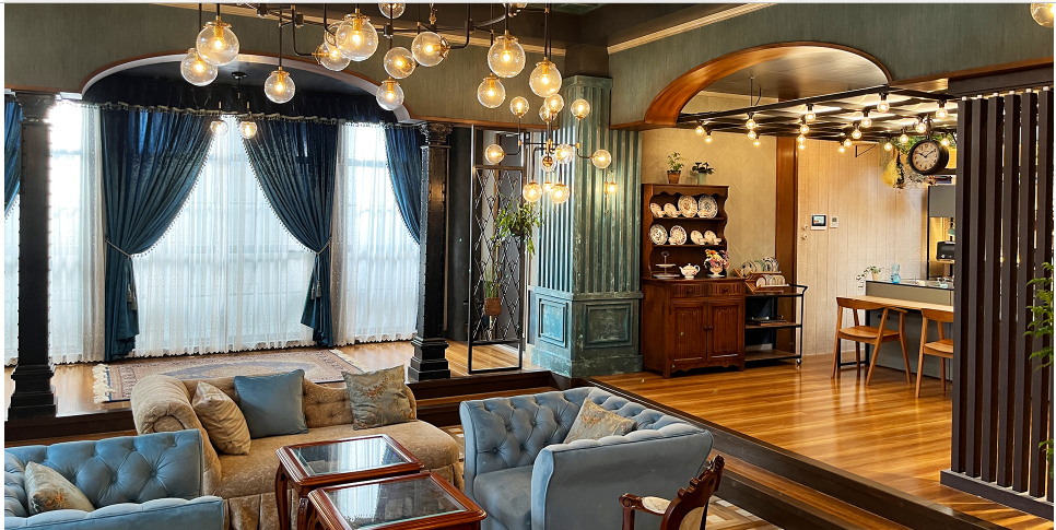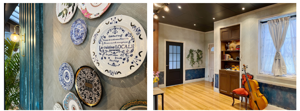 お部屋のセットが素敵ですね。翡翠の部屋セットにサンゲツさんの壁紙、見切り材、ガラスフィルムが採用されているそうです。