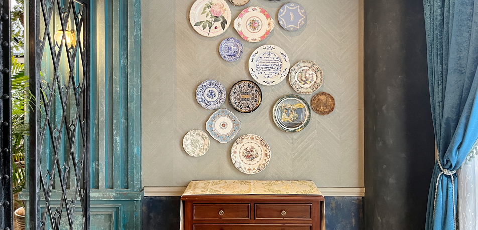 ヘリンボーン柄の明るいブルーの壁紙をベースに装飾された壁面が素敵コーディネート。