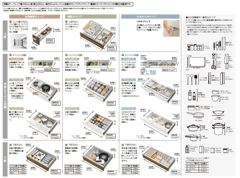 こんなに入って、使いやすいんです!使いたい物を使いたい場所に収納でき、楽にパッと出し入れできる構造になっています。加熱、調理、水まわりとエリアごとに使うものを収納できるようになっているので作業がはかどります。扉も力を入れずに楽に開け閉めできます。