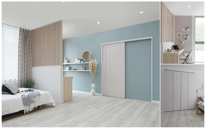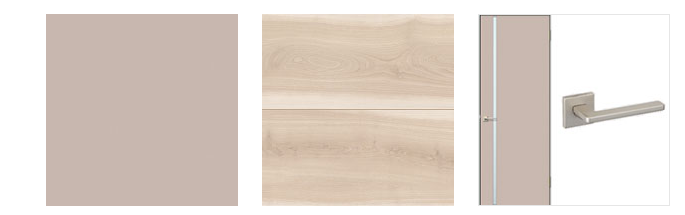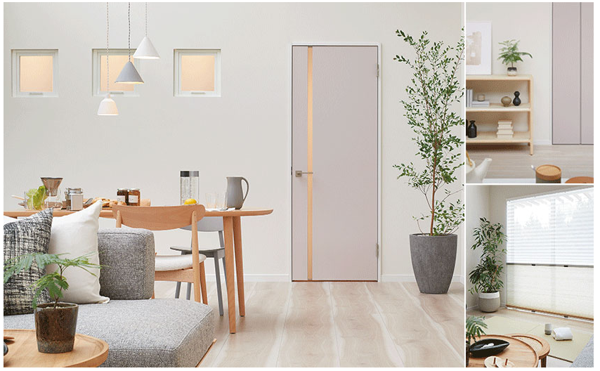 ソフトモーブ色のDoor。ほんのり赤身のあるグレー、梅鼠をイメージした柔らかな色合いが、空間のやさしいアクセントになります。室内窓から入る光や風が、開放感を届けます。ジャパンディ テイストが心地よい空間です。