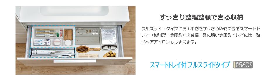 フルスライドタイプに洗面小物をスッキリ収納できるスマートトレイ(樹脂製・金属製)を装着。熱に強い金属トレイには、熱いヘアアイロンもしまえます!