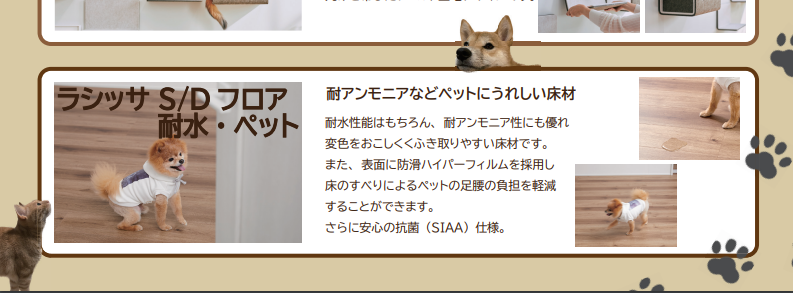 ペットにうれしい床材のラシッサS/Dフロア 耐水・ペット