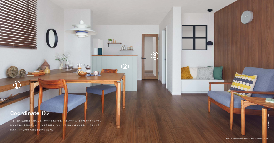 丁寧に使い込まれた北欧のビンテージ家具からインスピレーションを得たコディネート。均整のとれた木目が美しいチーク柄を基調に、シャープな印象のガラス建具でアクセントを加えた、こっくりとした落ち着きのある空間に。