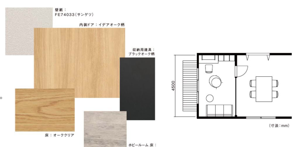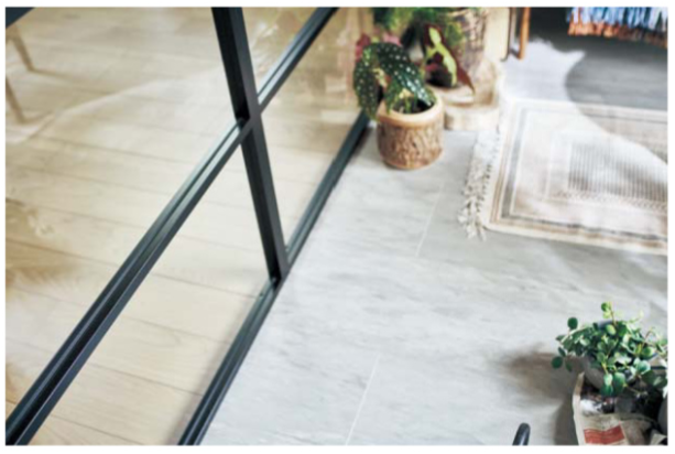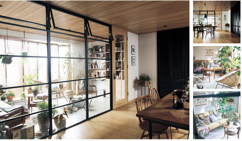 ダイニングとホビールームで床を変えて、気持ちの切り替えを。グリーンを扱う空間には、衝撃による割れや水に強いラピスタイルフロアーがおススメです。