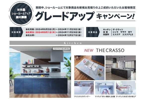 期間中、ショールームにて対象商品を新規お見積もりの上ご成約いただいたお客様に、「おすすめオプションに無償グレードアップ!」いたします。