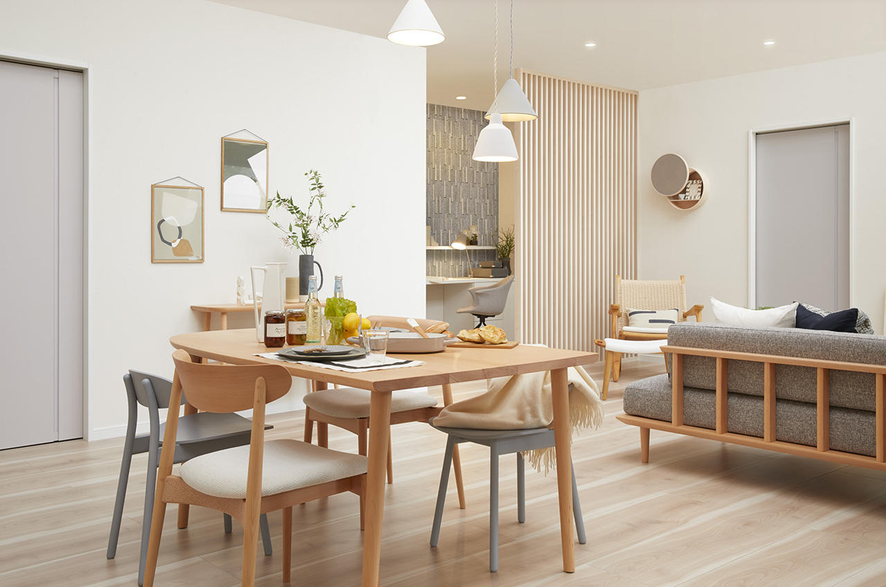 壁紙の白ベースに床材の色調を明るめにするとナチュラル感が増し好みに合う北欧ナチュラルな空間をつくりやすくなります。