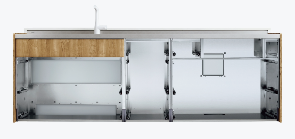 オールステンレスタイプのキッチンでは、ワークトップやシンクはもちろん、収納部分などのキャビネット全体がステンレス製。引き出しの底もステンレスになっているため、汁物などをこぼしても汚れがしみこまず、衛生的です。