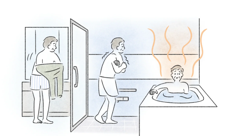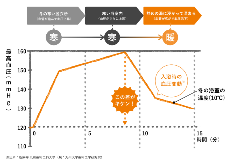 ヒートショックとは? 急激な温度変化により、血圧が急上昇または下降し、失神や心筋梗塞などを引き起こすことがあります。特に寒い脱衣所から暖かい浴室に入る際に、この現象が起こりやすく、高齢者には命に関わることも。