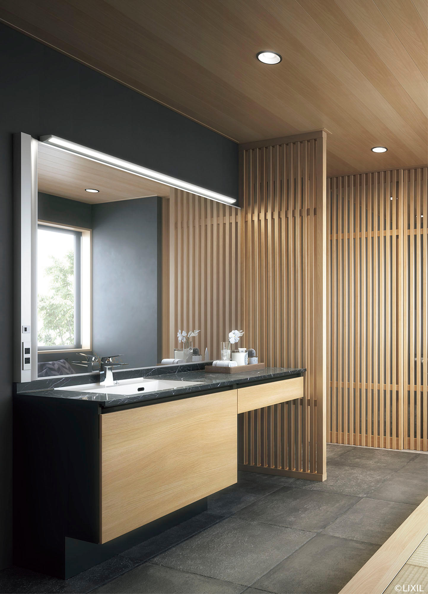 和の落ち着きと北欧のモダンさを融合させたジャパンディスタイルは、洗面化粧室をスタイリッシュに変える一押しのデザイン。上質で表情豊かな黒やグレージュのアクセントカラーを取り入れたカウンターや壁、床で、シンプルかつ上品な雰囲気を演出します。限られたスペースでも、見た目と機能を両立させるこのスタイルは、忙しい現代のライフスタイルにもぴったりです。