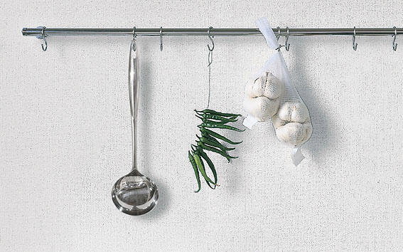 キッチンは物が溢れやすい場所。壁に取り付けられるフックや吊戸棚に取り付けられるラックを活用して、調理器具や調味料をすっきり整理。必要なものをすぐに手に取れるため、作業効率もアップします!