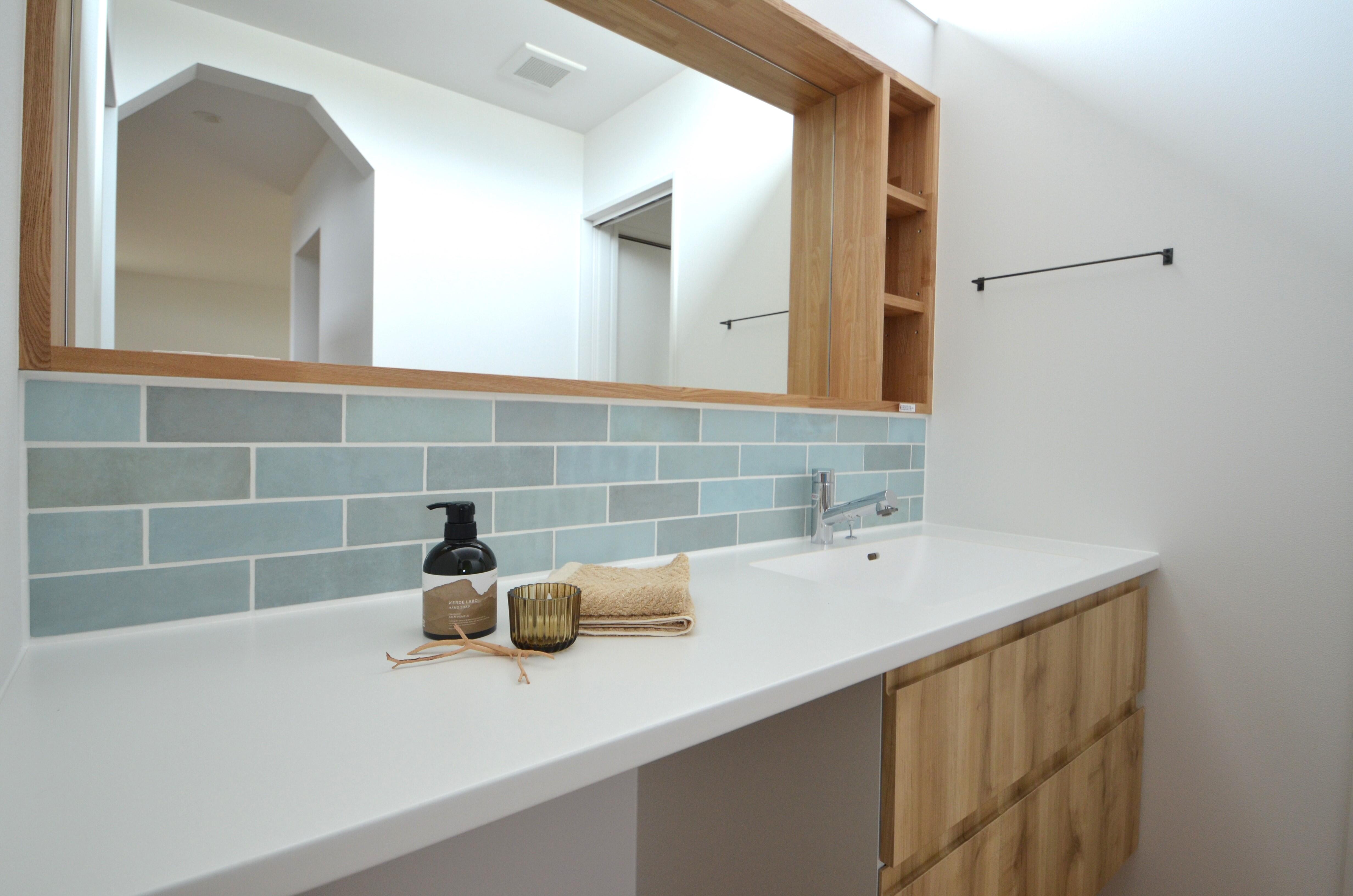 - 自然素材やアクセントのパステルカラーのクロスで、温かみのある洗面化粧室を実現。