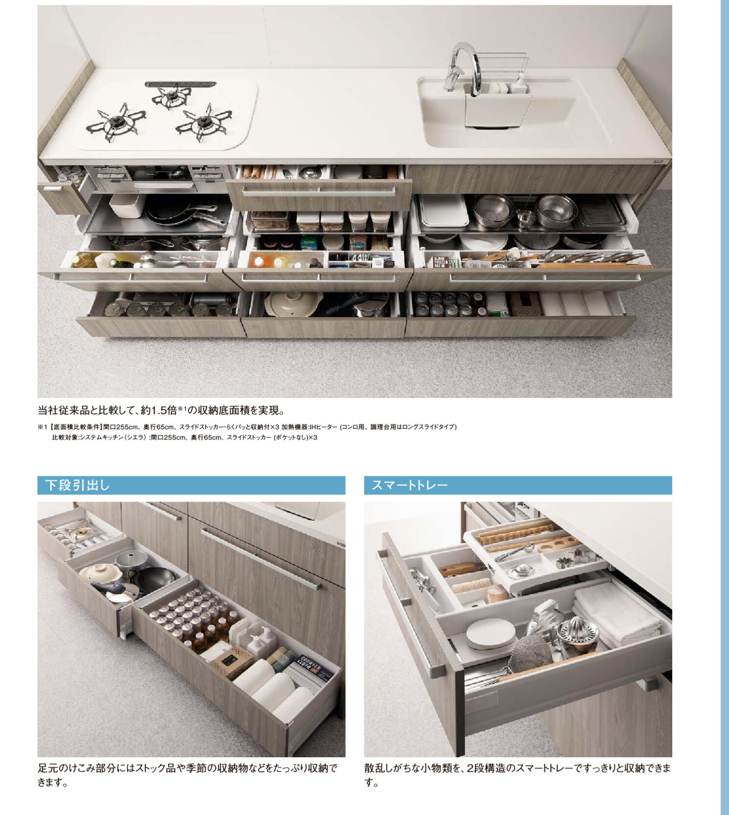 キッチンの「引き出し収納」は食器や道具を用途別に整理。片付ける際も迷わず収められるので、後片付けのストレスを軽減できます。