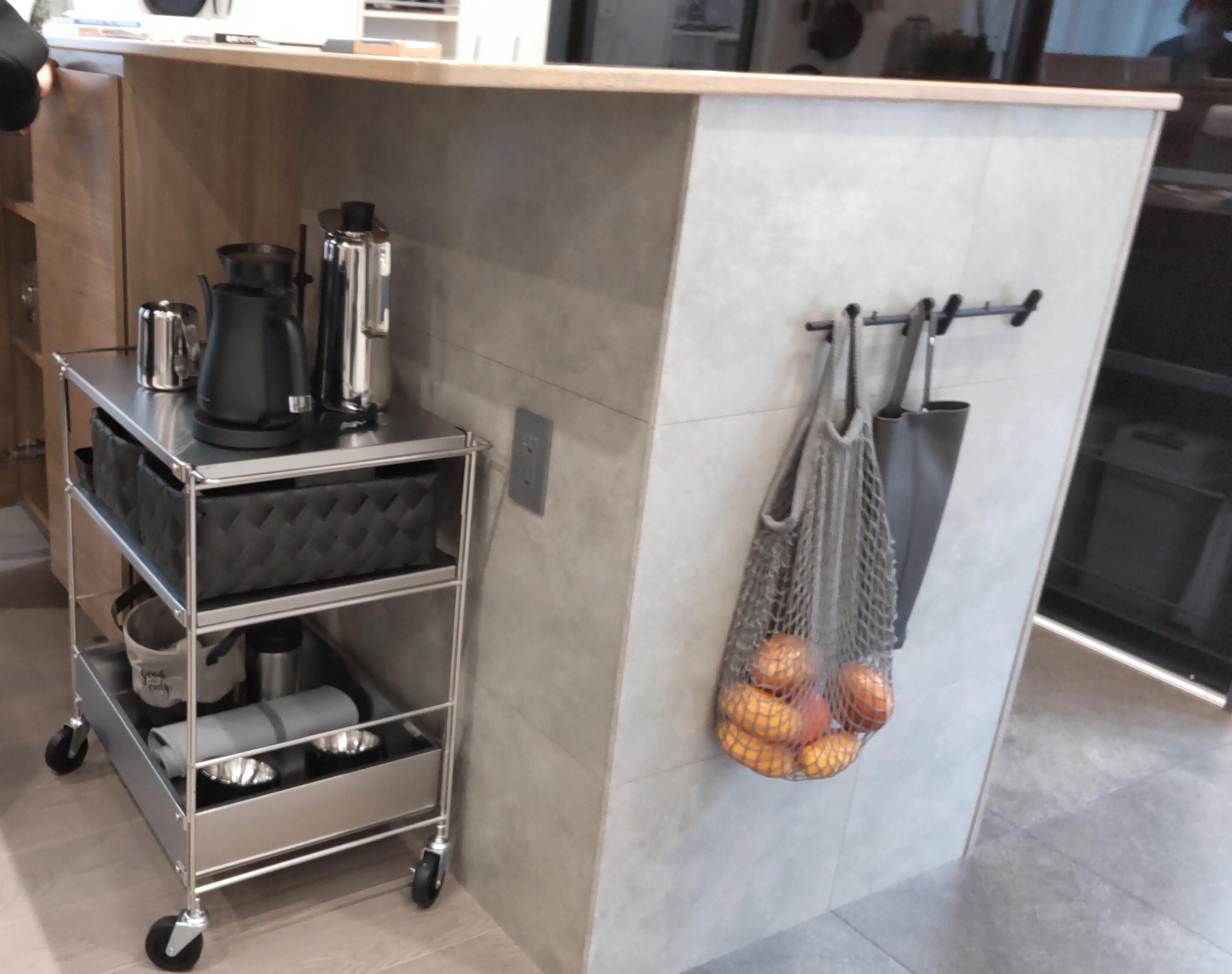 調理中に頻繁に使う器具や調味料をまとめて「ワゴン」に収納。必要な時にさっと移動できるので、効率的に作業できます。