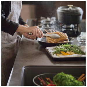 セラミックトップのワークトップや、シンクも下ごしらえができるラックなどを使うと、限られたスペースでも余裕が生まれます。大皿料理の準備もスムーズに。