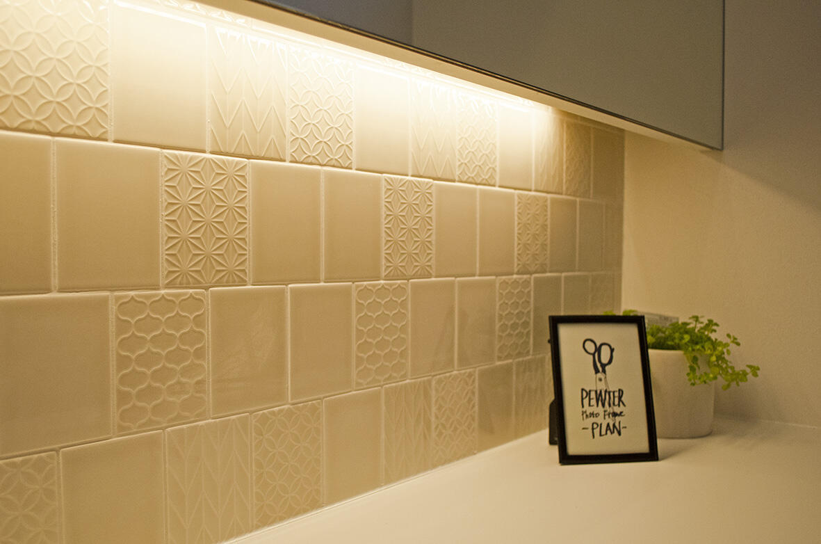 仕上げにアクセントのタイルや北欧デザインの小物をプラスすると、より洗練された雰囲気に。観葉植物を洗面台に置いたり、木製フレームのアートを飾るのもおすすめです。