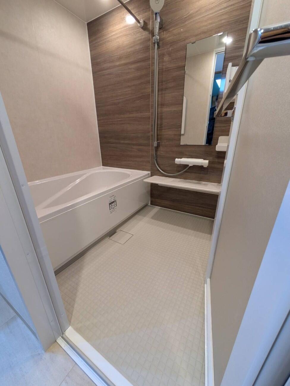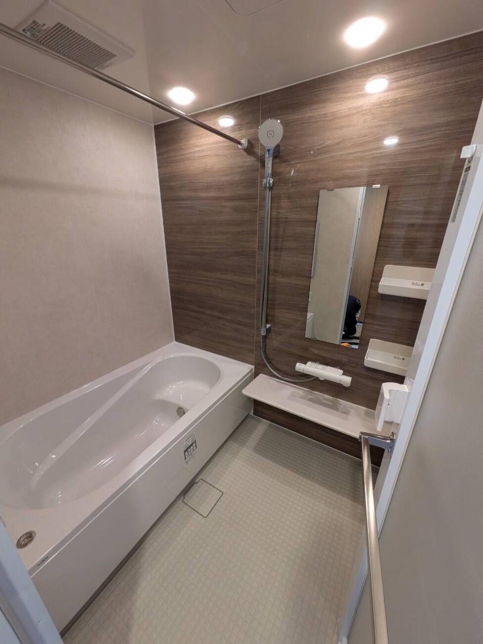 浴室には「LIXIL リノビオVシリーズ」、洗面化粧台には「ルミシス ボウル一体タイプ」を採用。どちらもウォルナットカラーを取り入れ、上質な雰囲気を演出しました。