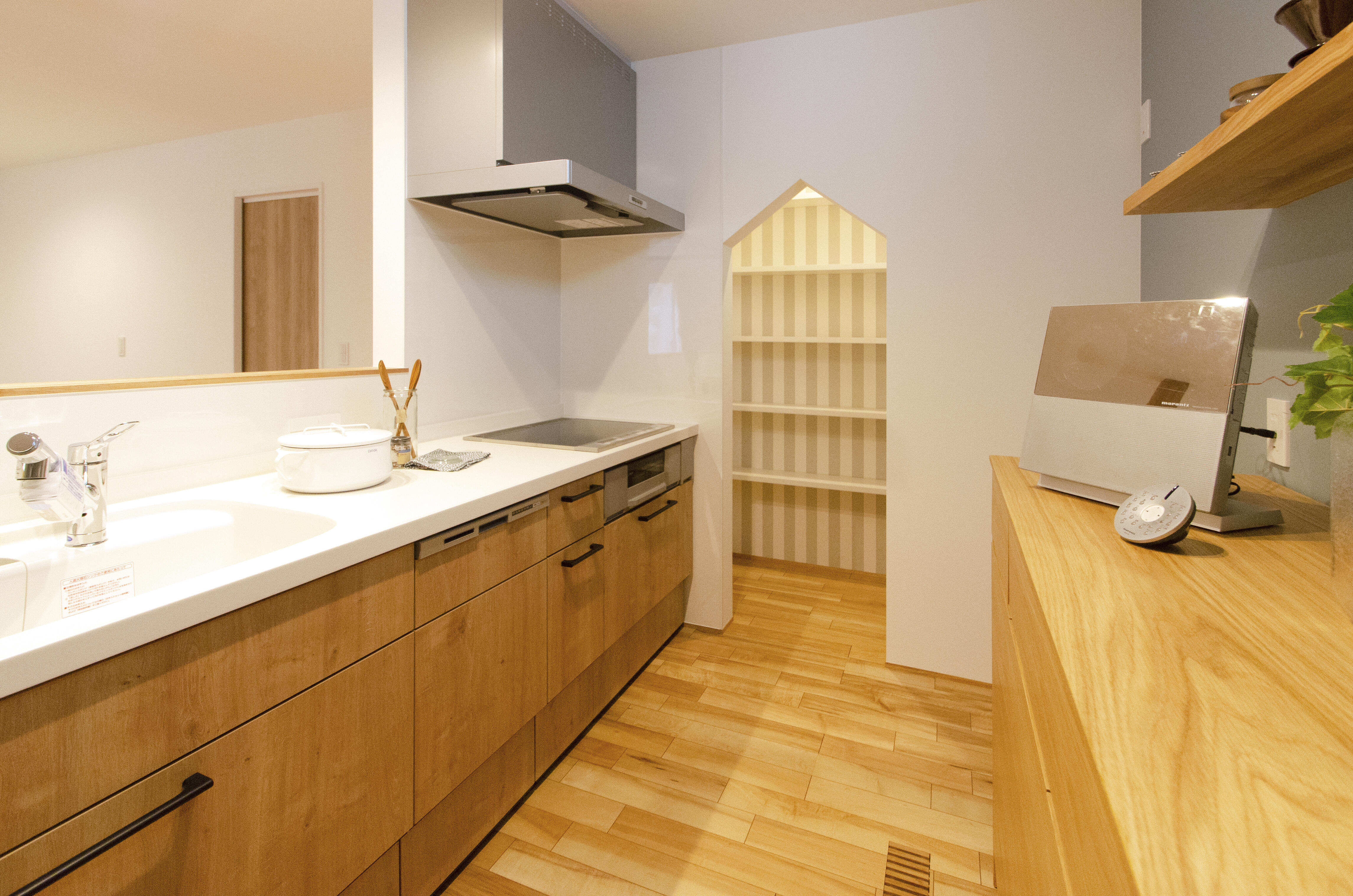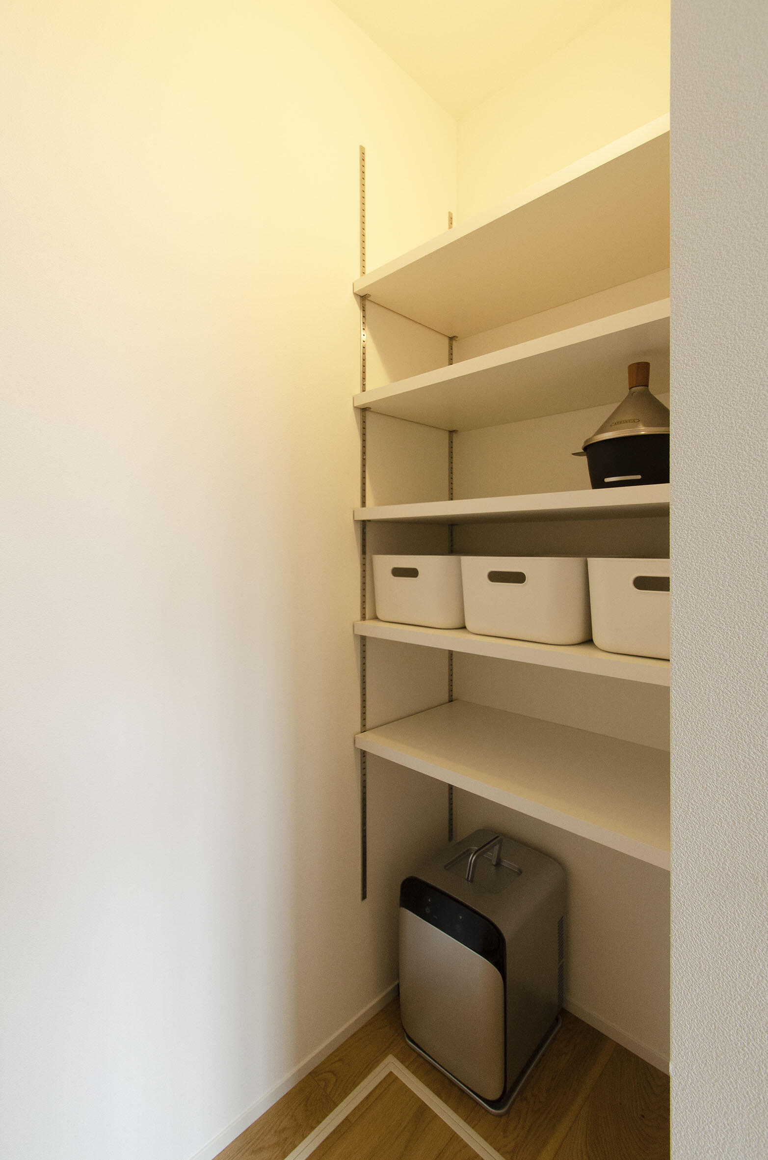玄関からキッチンにつながるパントリーを設けるなど、普段の行動の流れを考えた収納計画で、日常の片付けがぐっとラクになります。