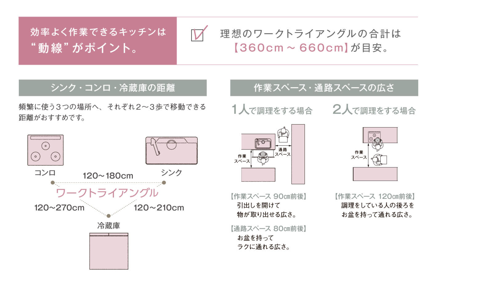 これは、冷蔵庫・シンク・コンロを結ぶ三角形が、ちょうどいい距離感になっていると動きやすいという考え方。