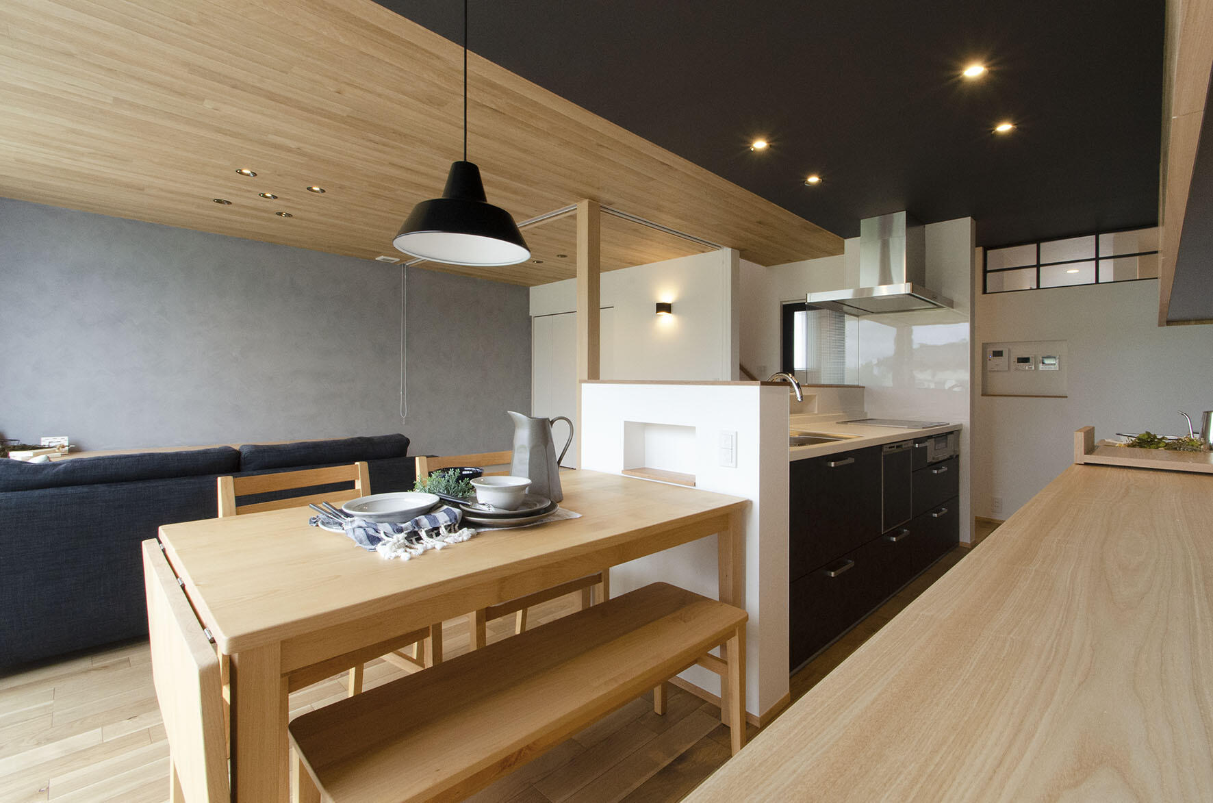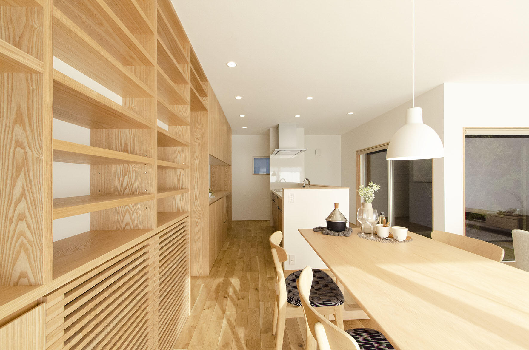キッチンとダイニングを仕切らず、一体感のある間取りにすることで、自然と人が集まる場所に。
