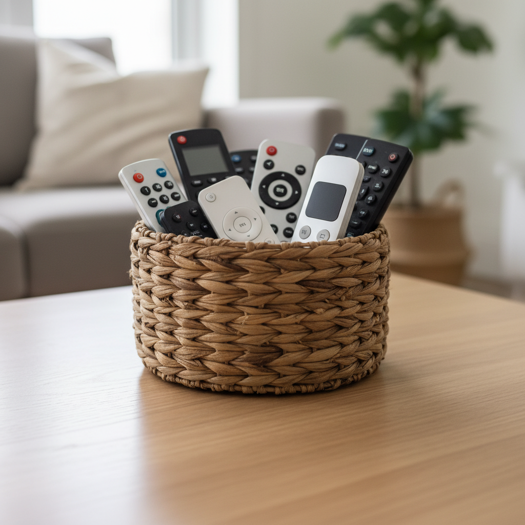 テレビのリモコン類はかごにまとめて取りだしやすい場所にすると、毎日の片づけも自然に整います。
