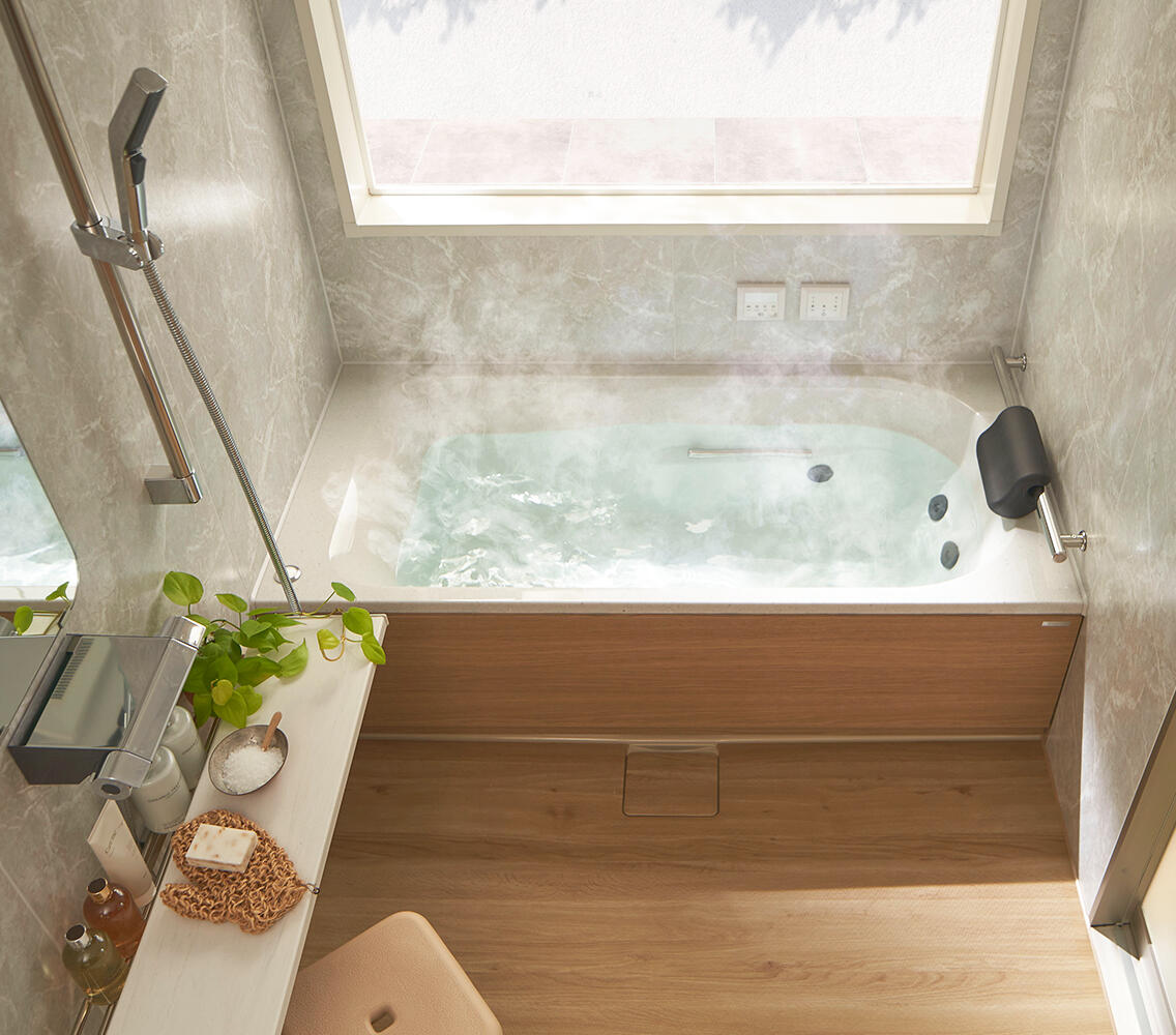 過度な装飾を避け、滑らかなラインの浴槽や洗面ボウルを選ぶと、落ち着きと上質感がアップ。 -