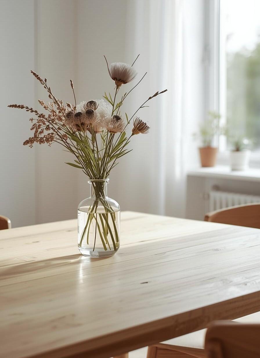 花を飾る際は花器選びもポイント。北欧ナチュラルならシンプルな陶器やガラス、ジャパンディなら落ち着いた和の器をチョイスすると、花と空間が自然に調和します。色や質感にこだわるだけで、花の見え方もぐっと上品になります。