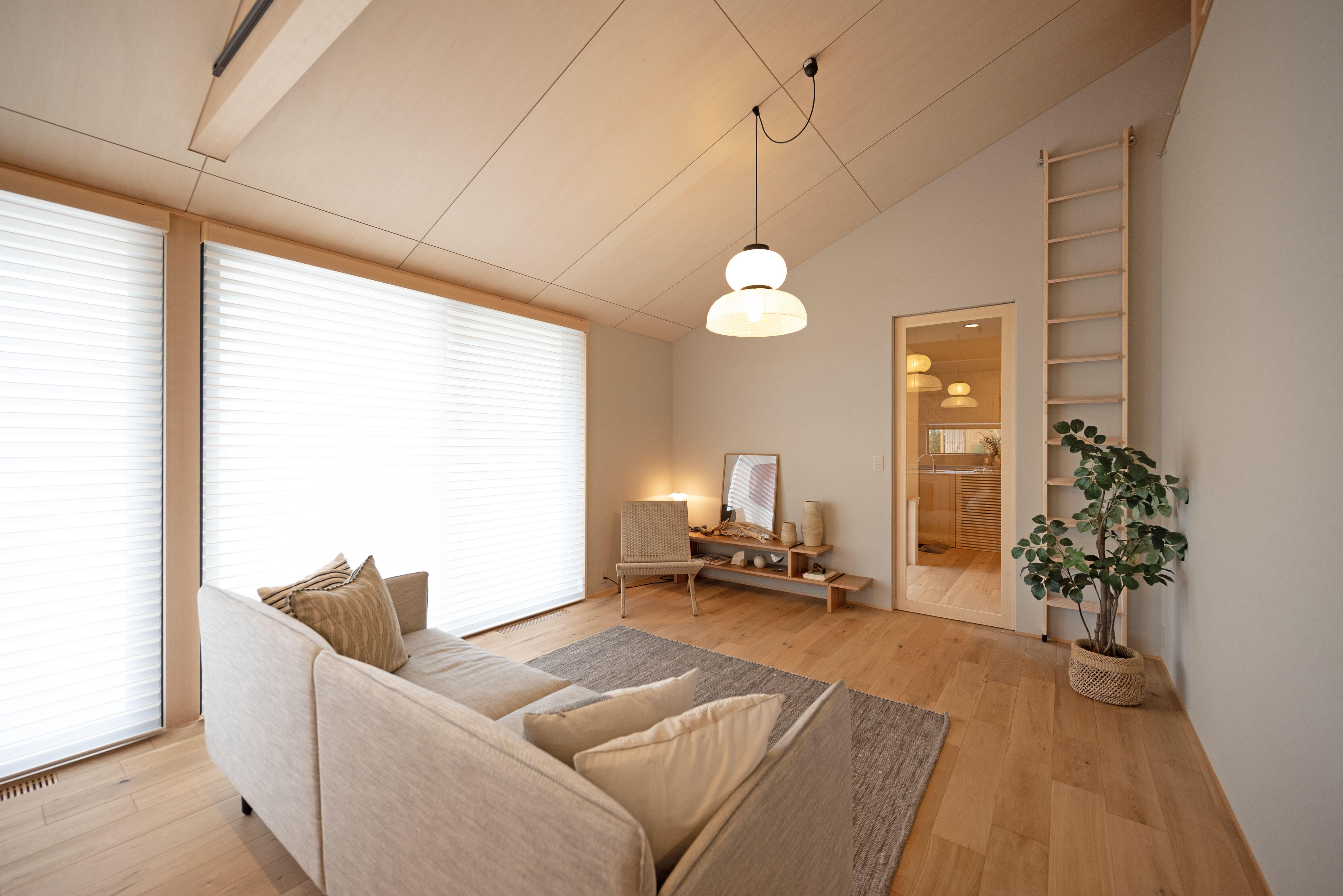 ソファ・テレビボード・収納を低めで揃えると目線が抜け、天井が高く感じられる効果が。