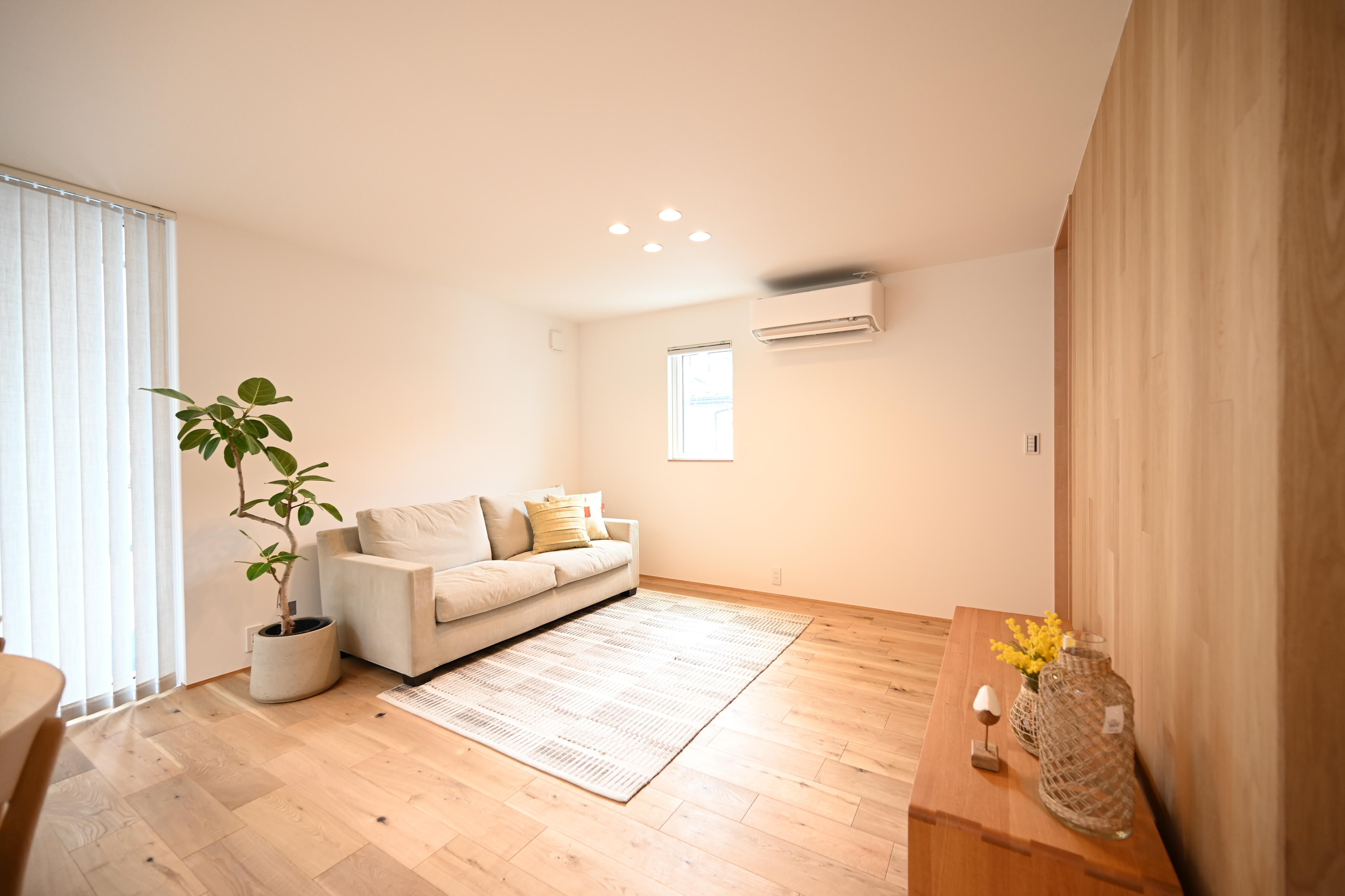 無垢材の床や木目の家具、マットな質感の素材や塗り壁など、触れたときのやさしさや温もりが重視されています。