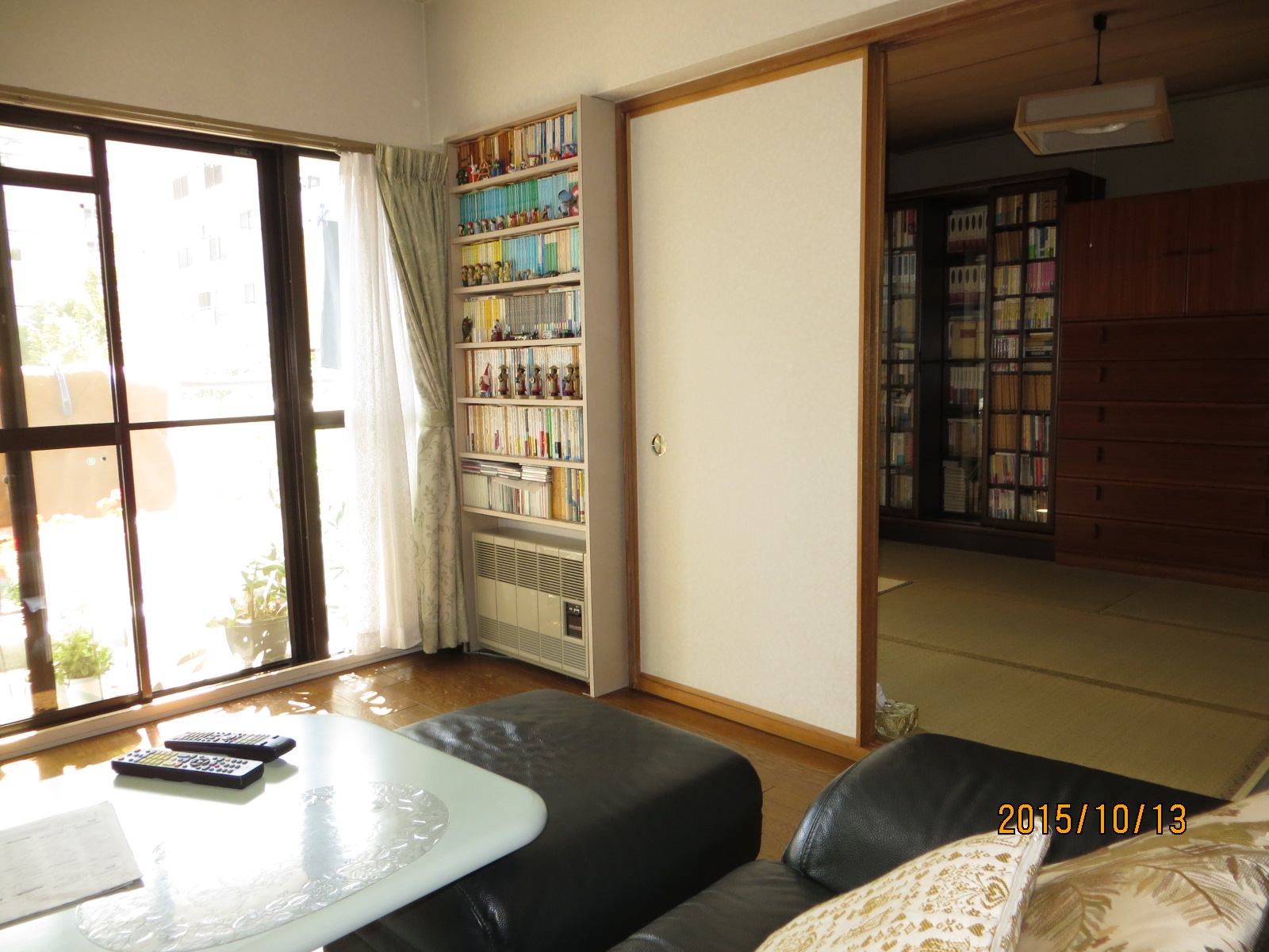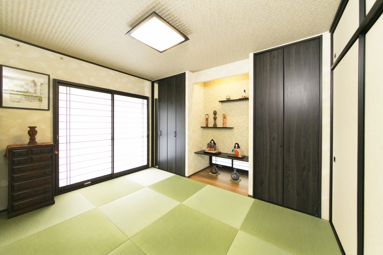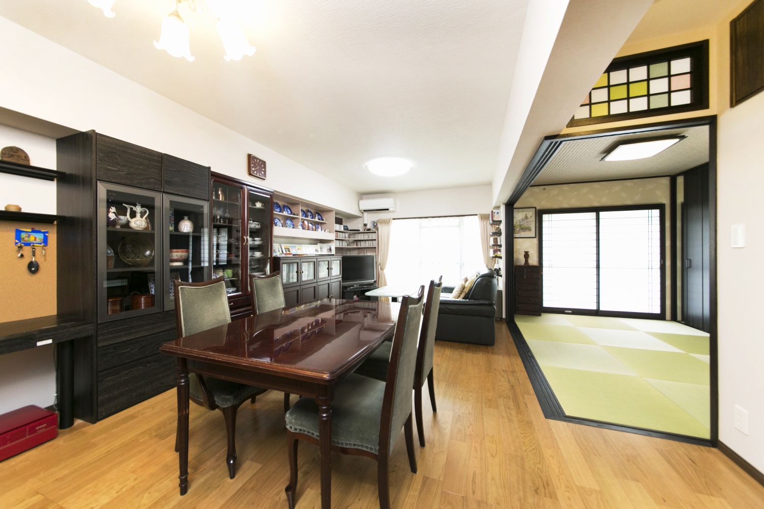 和室のコーナー柱と段差をなくし、リビングダイニングと一体感のある空間にしました。長年お使いになった愛着のある家具を残し、新しく取り付けた収納システムと調和するようにコーディネートしました。欄間は色付きの和紙で、楽しい雰囲気を醸し出しました。