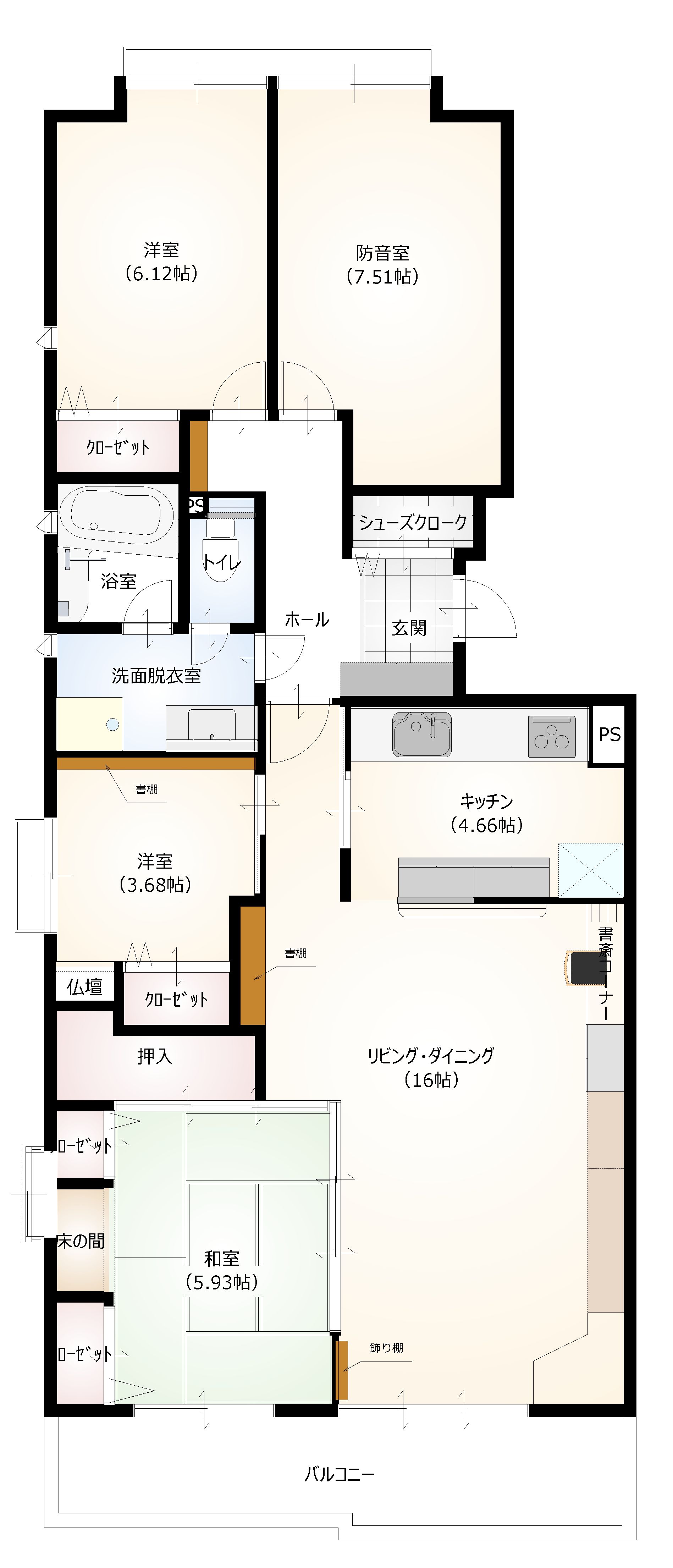 造作のクローゼットを設けて収納量を増やし、地窓の上は飾り棚を設置しました。