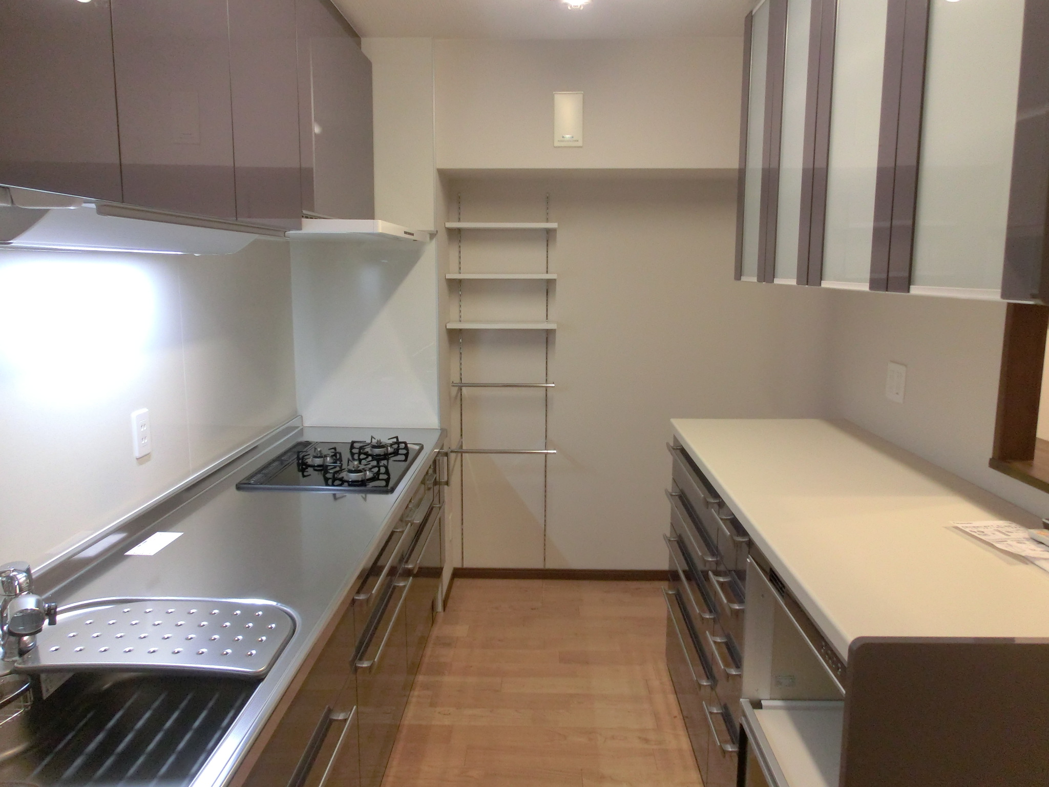 家電製品・調味料・食器等、使い勝手良く収納したいとのご要望でしたので、シンク下を普段使いの器具が取り出しやすいらくパット収納にし、可動棚を設置しました。また、ご夫婦で作業をしても、ゆったりとした動線を確保しました。