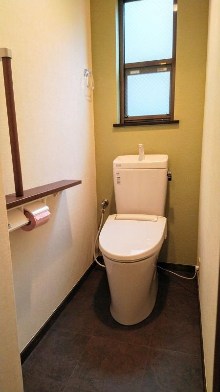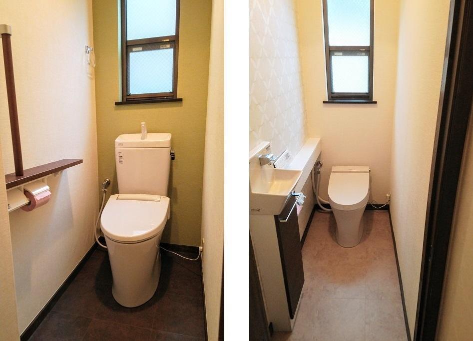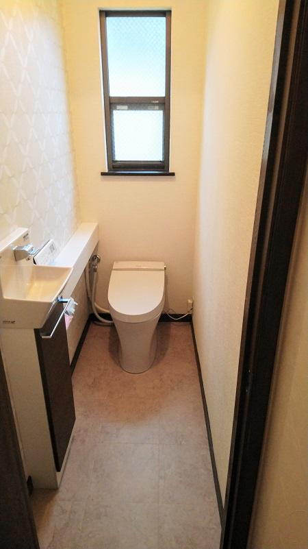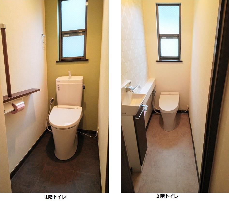 【1F】アメージュZリトイレフチレス、手洗い付タンク アクセントクロス リリカラLRP-73023、床CF サンゲツHM7015 【2F】サティスS手洗いカウンター付SY5 アクセントクロス サンゲツ77-878、床CF サンゲツHM7014