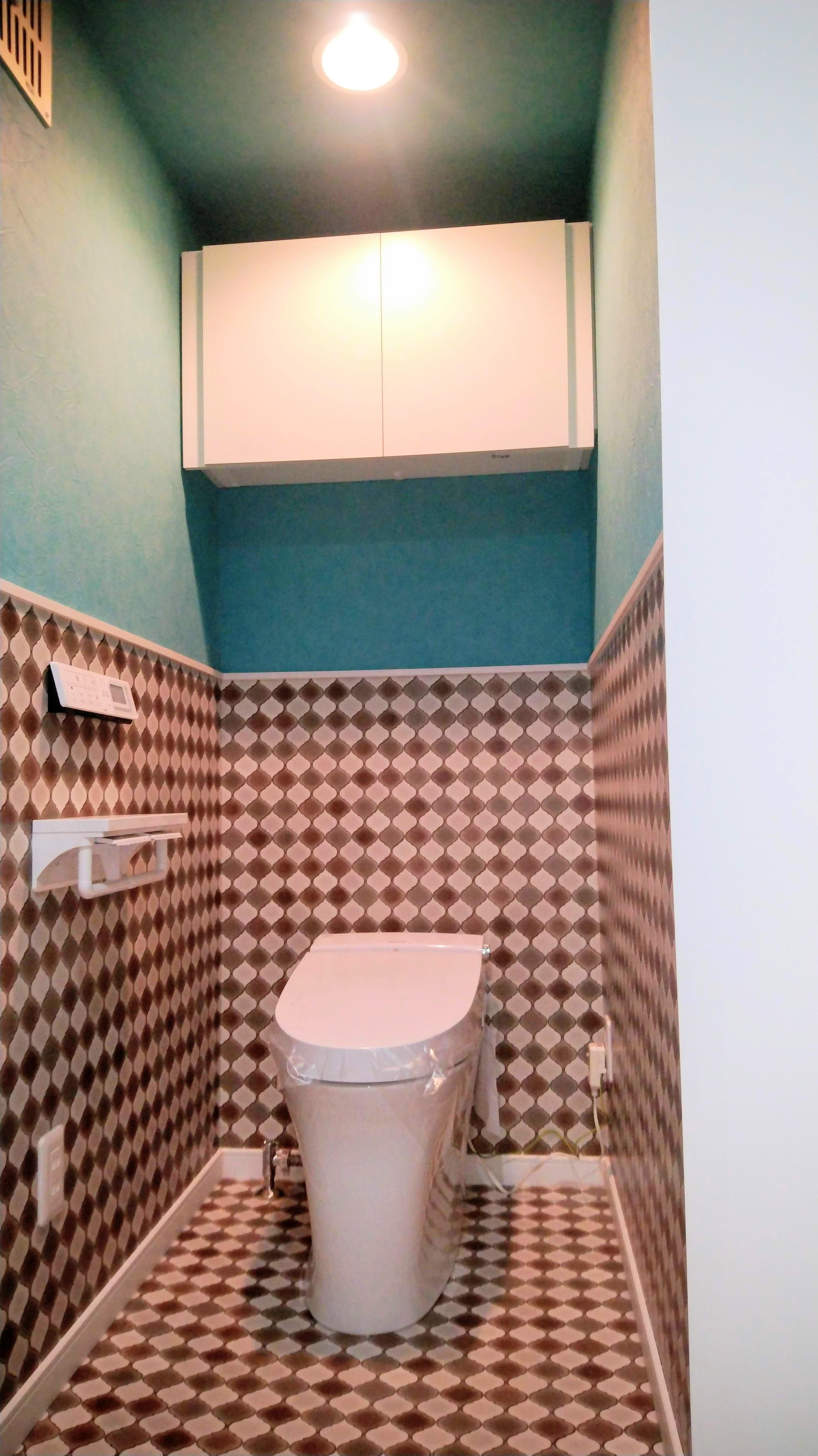 一見するとモザイクタイルにカラーペイント、外国のトイレのように見える空間ですが、実はこれ、ビニルクロスと腰壁状に貼ったCFで仕上げました! 古いマンションで躯体壁の状況は良くなかったのですが、クリエイティブなご職業の施主様のアイデアに職人さんがプロの技で応えました。本物のタイルに比べて圧倒的にお掃除もしやすいのでお勧めです(施主様談)。