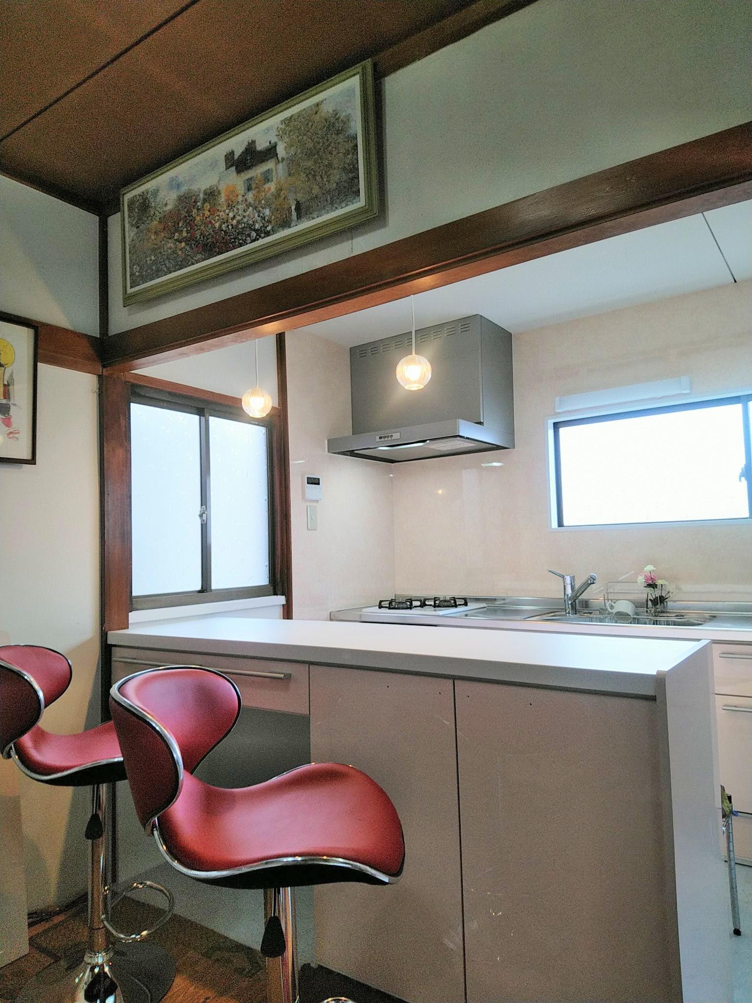 和室の鴨居や真壁の造作は残したレトロな雰囲気に、赤いチェアとペンダントライトが生えます。