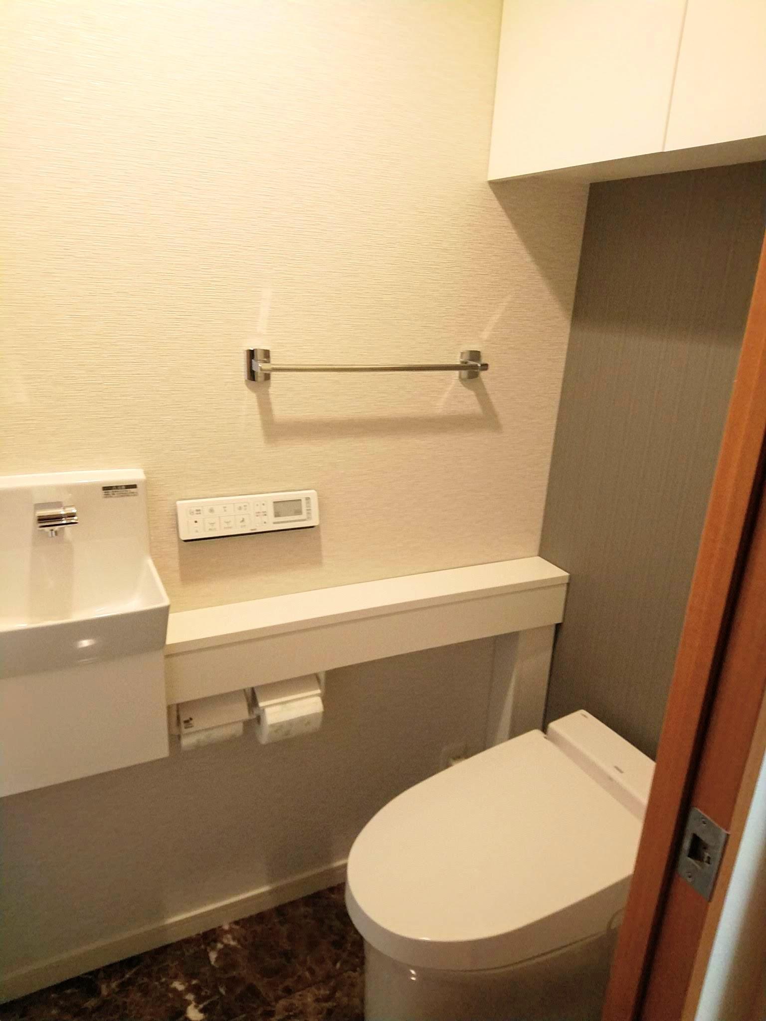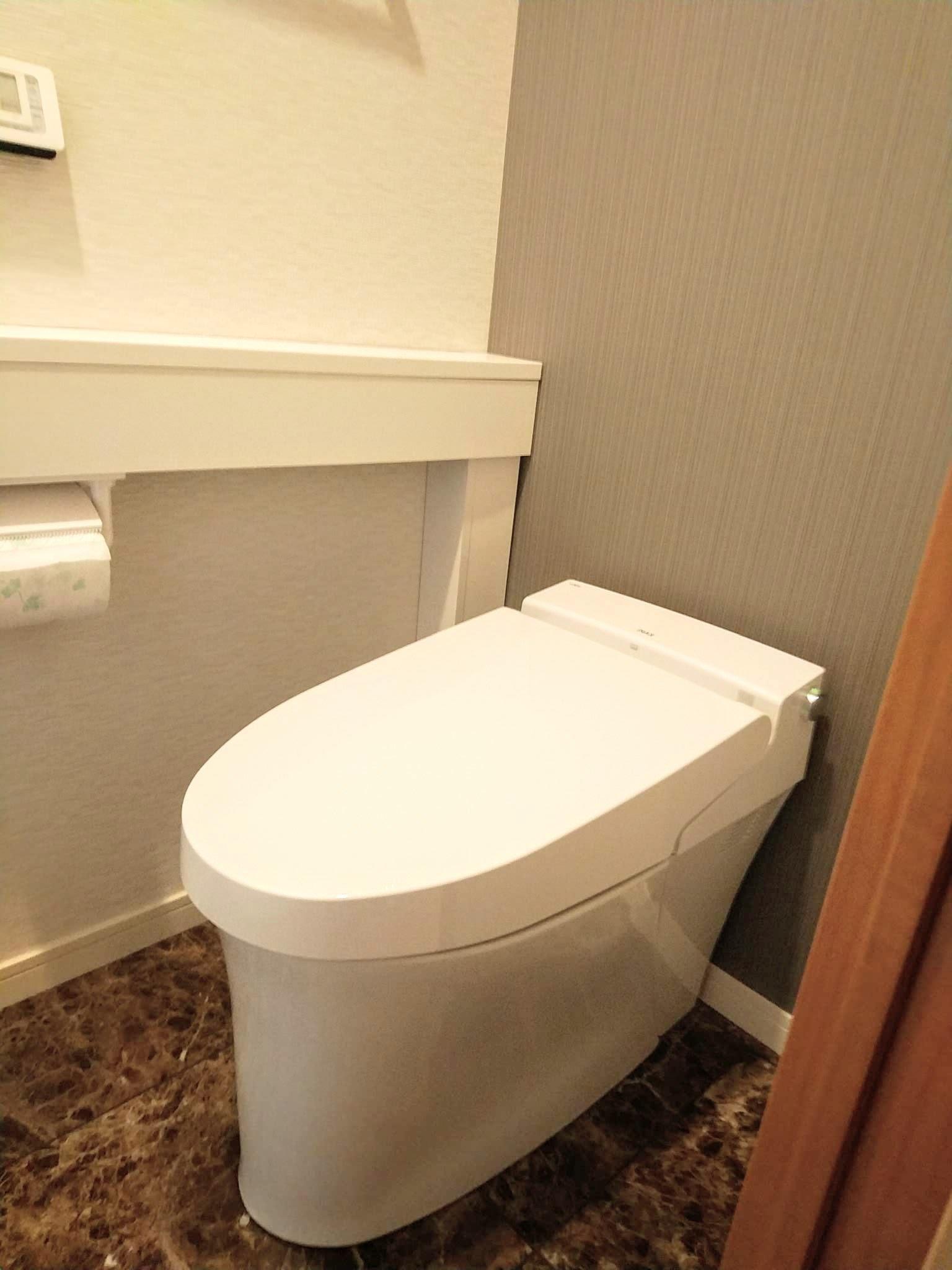 手洗いタンク付きのトイレからタンクレストイレにリフォーム。便器サイズがコンパクトになり空間が広くなりました。 給排水統合タイプで大がかりな工事不要で手洗いカウンターが付きました。