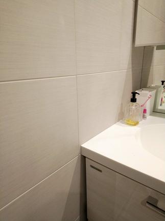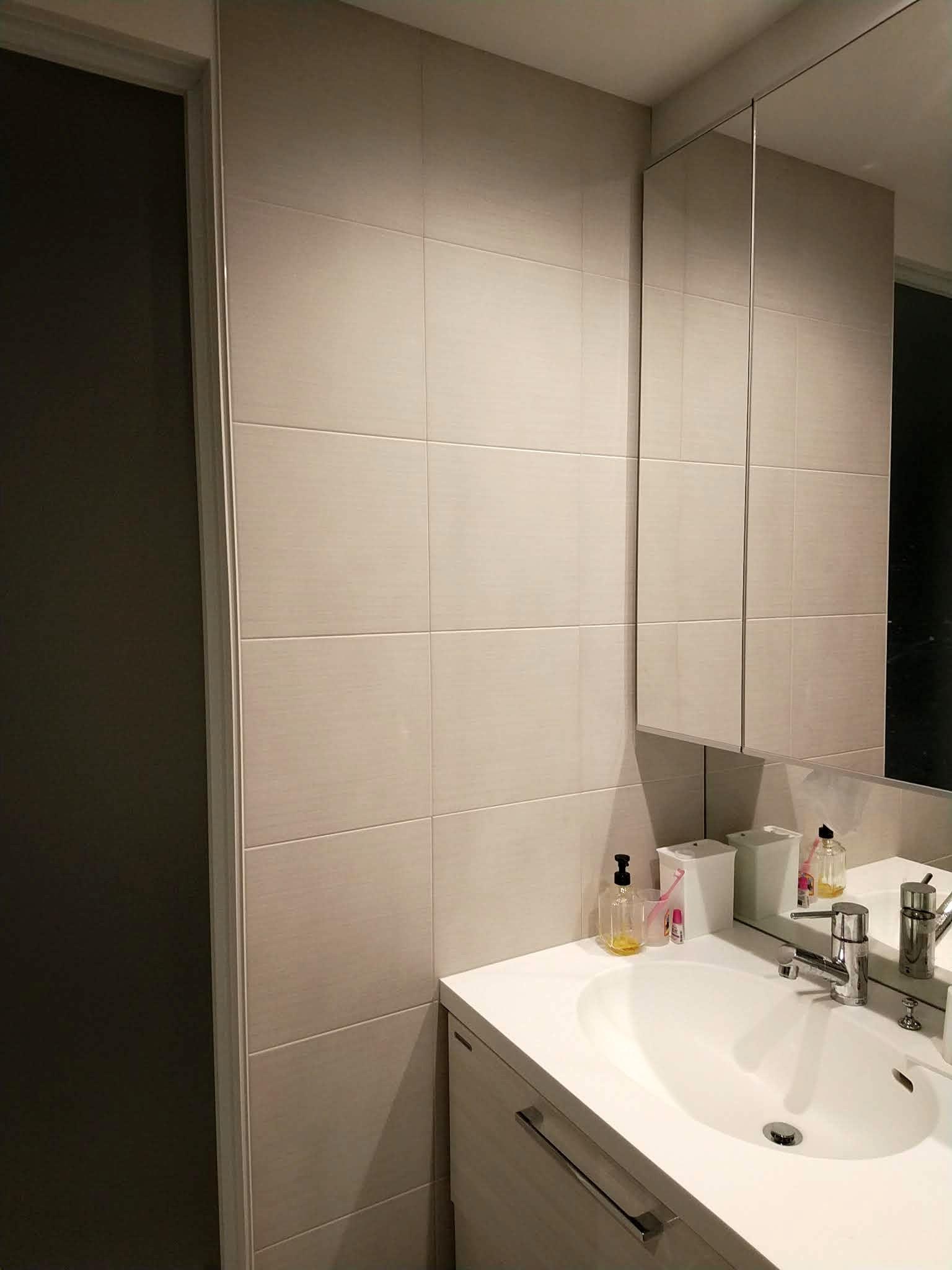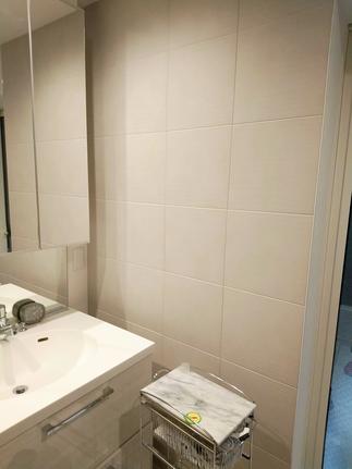 半地下ドライエリアの洗面室の為、湿気がこもりやすいとお悩みだったお施主様。湿気対策にもなり尚且つデザイン性も良いLIXILエコカラットプラスを採用されました。