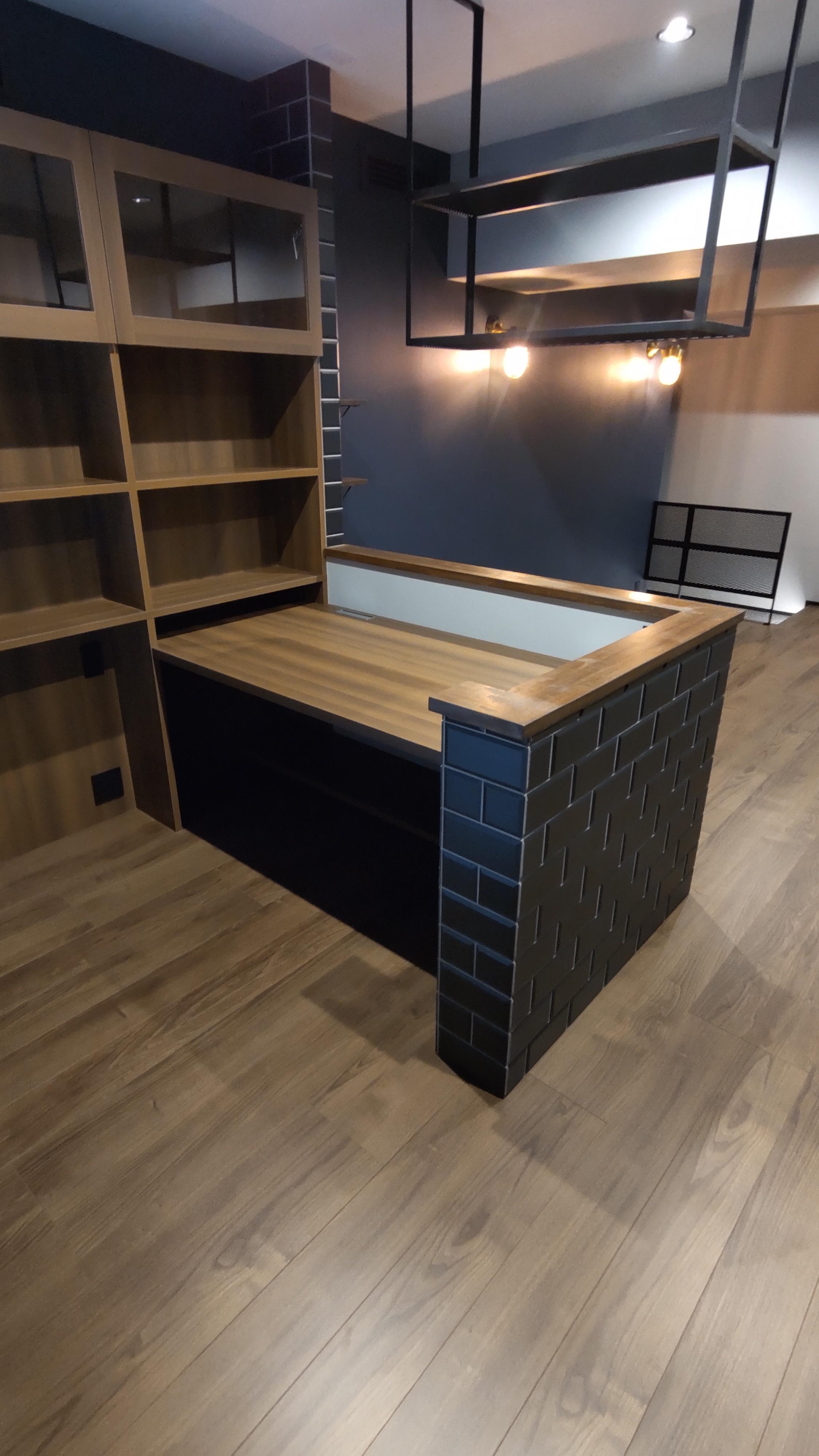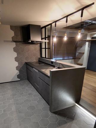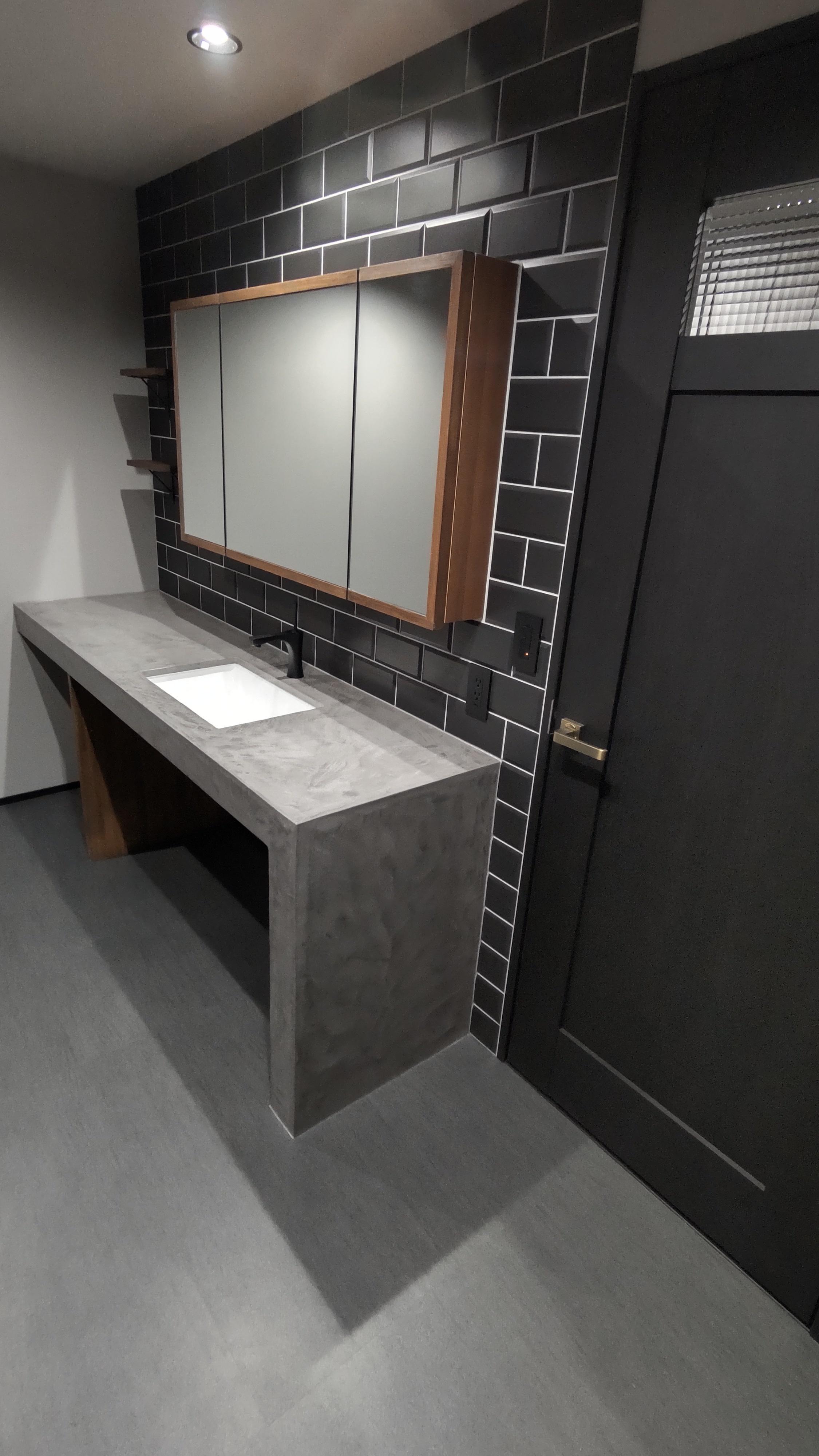 キッチンや洗面台の造作カウンターはモールテックスを採用、クールな仕上がりとなりました。