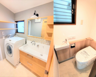 洗面化粧台:LIXILピアラ木製一面鏡:LIXILエスタ壁タイル:LIXILスマートモザイクシート SMTS‐630/KLG‐11水はねが気になる壁にはモザイクタイルを貼りましたトイレ:LIXILサティスSリトイレ手洗い付き ライトオーク色